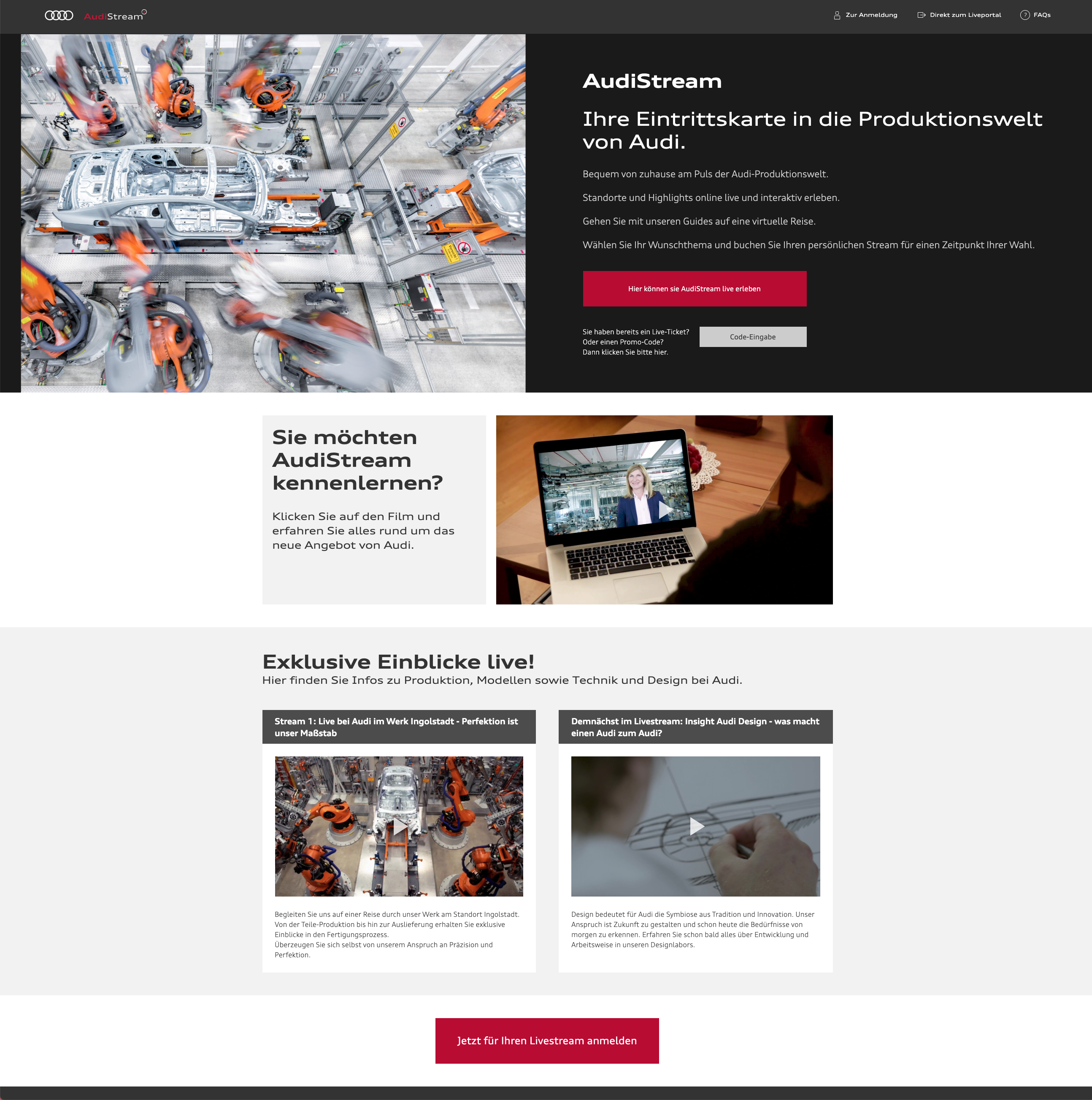 AudiStream (https://www.audi.stream). Ein interaktives Online-Angebot, welches aktuelle und stetig wechselnde Einblicke in verschiede Themengebiete aus dem Kosmos von Audi gibt. Erfahrene Tourguides teilen ihr Wissen aus zahlreichen Werkführungen vor Ort und moderieren die virtuellen Rundgänge live aus einem Studio. Termine lassen sich direkt online vereinbaren.